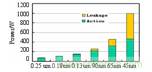 在深亞微米工藝下,電路的功耗主要是跳變功耗,短路功耗和漏電功耗可以忽略不計(jì)。但隨著工藝發(fā)展到納米級(jí),漏電功耗在整個(gè)功耗中的比例將顯著提高(如下圖所示)。