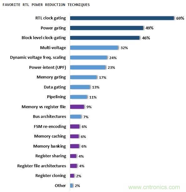除了上述這些方法,高效的低功耗技術(shù)還有許多,比如襯底反偏(加反向電壓降低襯底漏電),多閾值單元(Multi-Vth cell)等等設(shè)計(jì)方法。下圖是一些比較熱門的RTL級(jí)低功耗技術(shù)。