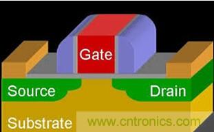 這里,我們盡量把事情說簡(jiǎn)單。上面這副示意圖中就是一個(gè)典型的半導(dǎo)體晶體管。其中兩個(gè)綠色的部分(源極Source和漏極Drain)分別是晶體管的兩級(jí),類似電池的兩級(jí)。紅色的部分就是用來控制這兩個(gè)電極的通斷的,而通斷分別對(duì)應(yīng)數(shù)字化時(shí)間的1和0。所謂數(shù)字化世界其實(shí)也就是非常非常多的晶體管的通斷變化組合出來的。紅色柵極(Gate)的寬度就是我們通常所說的溝槽寬度或者線寬——我們通常說的多少多少nm就是指的這個(gè)寬度。