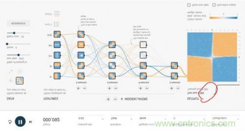 整個網絡的輸入層是FEATURES(待解決問題的特征),例如x1和x2表示垂直或者水平切分來劃分藍色與黃色點,這是最容易理解的2種劃分點的方法。其余5種其實不太容易想到,這也是傳統的專家系統才需要的,實際上,這個游樂場就是為了演示,1、好的神經網絡只用最基本的x1,x2這樣的輸入層FEATURES就可以完美的實現;2、即使有很多種輸入特征,我們其實并不清楚誰的權重最高,但好的神經網絡會解決掉這個問題。