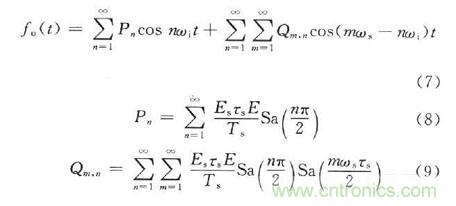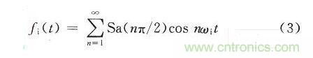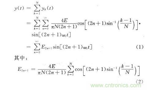 首先對(duì)量化過程進(jìn)行分析,現(xiàn)假設(shè)基帶輸入信號(hào)為一個(gè)正弦信號(hào)gi(t)=Esinωit,量化位數(shù)為N,經(jīng)過量化后的信號(hào)可用階梯波y(t)表示,y(t)可以被認(rèn)為是N對(duì)矩形波的疊加。如果A/D變換的量化位數(shù)為m,那么正或負(fù)半周的量化臺(tái)階數(shù)為N=2m-1。階梯波的表達(dá)式為: