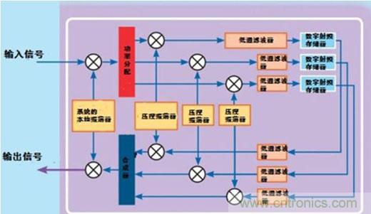 接著,修正的數(shù)字信號(hào)轉(zhuǎn)換為模擬射頻信號(hào)。通過使用與初始頻率轉(zhuǎn)換同樣的本地振蕩器,這個(gè)信號(hào)會(huì)被頻繁地轉(zhuǎn)換為接收頻率。降頻轉(zhuǎn)換和升頻轉(zhuǎn)換時(shí),使用唯一的振蕩器保持了信號(hào)相位的相干性。