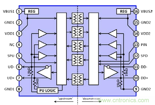 ADI的ADuM4160 USB數字隔離器2滿足全部要求,采用16引腳SOIC封裝。原理框圖如圖3所示。它包含一對USB收發器、5個基于iCoupler®的數字隔離通道、控制邏輯以及2個“智能調節器”。它還集成1.5 kΩ上游上拉電阻,以及15 kΩ下游下拉電阻。