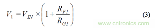 另外,輸入放大器的偏置電流會導致因增益而異的失調。由于輸入放大器和輸出緩沖器采用同一芯片,因此可以利用其偏置電流的相對匹配性來消除上述失調變化。將一個大小等于 RF2與 RF1之差值的電阻與開關 S2A 串聯,可以減少失調-電壓差。下面的推導公式說明,在 V1 采樣可產生所需的信號增益,且無增益誤差。RS表示開關電阻。V2 可以利用同樣的方法導出。