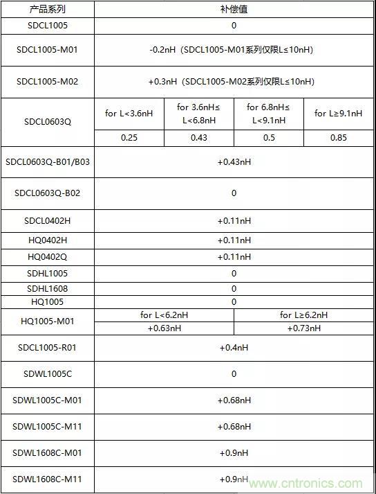 由此看來,射頻電感的真實電感量值,并不是測試儀器的測量讀數,而是等于測試儀器的測量讀數加上Lsc,這個Lsc就被定義為補償值寫進了射頻電感的規格書。