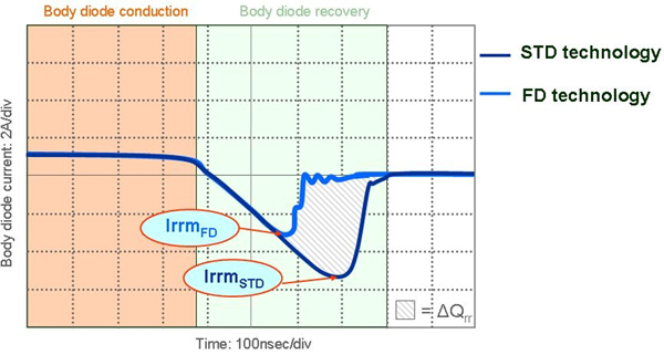 為改善在這些特殊應用中體二極管的性能,研發人員開發出具有快速體二極管恢復特性MOSFET。當二極管導通后被反向偏置,反向恢復峰值電流Irrm較小,完成恢復所需要的時間更短(見圖3)。