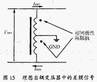 從差模信號(hào)看,有中心抽頭的自耦變壓器是兩個(gè)在相位上相同的對(duì)分繞組,見(jiàn)圖15。這就意味差模電流在其中所形成的磁場(chǎng),會(huì)使其對(duì)差模電流呈現(xiàn)高阻抗。相當(dāng)于對(duì)差模信號(hào)并聯(lián)了一個(gè)高阻值的阻抗,它對(duì)差模信號(hào)的大小沒(méi)有影響。