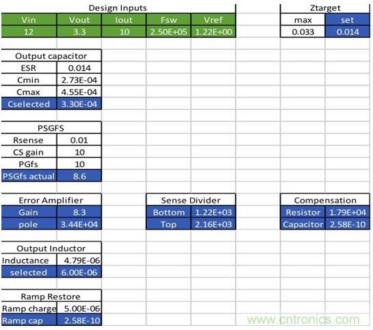 最小電容和最大電容限值也是計算出來的,而最終入選值還可供選擇,選定值再用于剩下的計算。這些覆蓋值也允許其它輸入,包括PGFS和輸出電感。重要的是,這些決定和選擇要按此順序進(jìn)行。