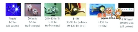 而尾燈組對于亮度需求約300 ̄500lm,一般選用1W的SMT封裝結構,單體封裝亮度約10 ̄20lm,效率可達15 ̄40lm/W。以上都是已經應用于車體的光源,而目前LED廠與車廠正積極合作,試著將LED導入前照系統(頭燈、霧燈)中,其中車廠對于頭燈的亮度需求約2000流明的白光,LED廠目前則應用高瓦數的SMT LED封裝架構,每單體封裝可輸出100 ̄200lm,效率預期提高至50 ̄100lm/W。