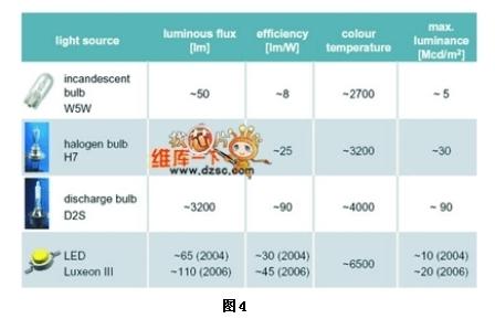 目前使用于車上的燈源可區分為白熾燈泡、鹵素燈泡、氣體放電式燈泡與LED光源,其比較如圖4所示。