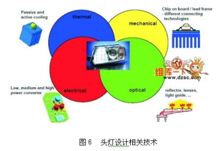 開始著手設計頭燈之前,應先考慮法規上的相關規定,包括光型亮度,環境測試,亮度衰減等需求,進一步考慮相關光學設計,機構設計,耐熱設計與電控設計等細節,對于LED而言,光學設計的考慮除了反射罩設計之外,尚需考慮LED本身的出光光型,不同的封裝型態將產生不同的光型輸出,進一步將影響反射罩或成像透競的要求,與傳統頭燈設計需考慮不同燈泡(H1、H4、H7、H11等)類似。在傳統的頭燈設計上,燈泡本身的光子釋放來自加熱鎢燈絲,不會因自身發出的熱或來自引擎室的高溫而影響亮度輸出,散熱重點落在整個頭燈腔體的均溫設計而非燈泡的散熱,但在頭燈材料的選擇上則需考慮是否可承受來自燈泡的高溫(頭燈腔體約承受100℃的溫度,霧燈腔內溫度可高至300℃),所以在此選用的材料一般都以耐熱材為主;然而對于LED而言,其光子釋放來自于PN接口的能階跳動,與溫度呈現負相關,溫度越高則光源輸出越弱,因此散熱成為LED作為光源設計的重要課題。