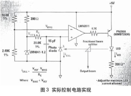 圖2示出采用運放的電路,用于分析控制環(huán)路。此電路驅(qū)動1個PNP晶體管,此晶體管為產(chǎn)生光發(fā)射的LED提供電流。光發(fā)射照射到光電二極管,光電二極管把光發(fā)射轉(zhuǎn)換為非常小的電流(通常為10mA)。在這種情況下,二極管用在反向模式,所以在無光呈現(xiàn)時,電流為零,但是光電二極管和放大器中的漏電流(也稱之為“暗電流”)是過載。此條件牽引由晶體管基極電阻所限制的電流,開始時晶體管處于飽和狀態(tài)。一旦電流開始流經(jīng)晶體管,則LED或激光二極管將開始發(fā)射光。光電二極管把此部分光轉(zhuǎn)換為電流,流經(jīng)RG。隨著電壓趨于VBIAS(在圖2中為地),環(huán)路將閉合并保持驅(qū)動晶體管的電流來維持LED中的電流以保持恒定光強度(或光電二極管中的電流)。此構(gòu)成電路DC分析的基礎。圖3為用NS公司LMV2011精密運放實際實現(xiàn)電路。用NS的LM4041-1.2并聯(lián)基準產(chǎn)生基準電壓,提供固定的1.225V基準電壓。設置基準中的電流在10mA左右,這是工作電流的中間值。由兩個1%精度電阻器產(chǎn)生VBIAS,其值設置在1V左右。為了計算閉合控制環(huán)路中的光電二極管電流,VREF和VBIAS之差除RG。注意,為了此電路工作,VBIAS必須小于VREF。對于10mA光電二極管電流,RG為0.2×10E-6或 20.0KΩ。4.7KΩ電阻器限制PN200A PNP晶體管基極電流,設置在1mA左右。晶體管b值為100左右,所以晶體管可提供的最大電流為100mA左右,這超過了微型SOT-23封裝的熱耗。為了避免晶體管的熱擊穿,用與LED或激光二極管串聯(lián)的電阻器限制晶體管集電極電流。若需要更大電流,則具有較大集電極電流的晶體管應該用較大的封裝(如SOT-223)。為限制電路帶寬以保持穩(wěn)定性,用與光電二極管并聯(lián)的15pF電容器使放大器滾降頻率在250KHz左右。