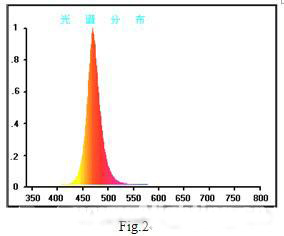 以InGaN藍光LED和1號熒光粉制成的白光LED的發射光譜示如Fig.6,其光效為55lm/W,色溫4500K。這是本人所知道白光LED的最高光效報導(據測試國內1W白光LED的光通量大多在40lm以下)。采用2號和3號混合熒光粉試制的白光LED的發射光譜示如Fig.7,其顯色指數提高到82,色溫4200K,但光效確降低到20lm/W。