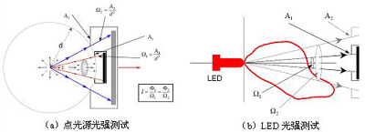 如圖4所示,點光源光強在空間各方向均勻分布,在不同距離處用不同接收孔徑的探測器接收得到的測試結果都不會改變,但是LED由于其光強分布的不一致使得測試結果隨測試距離和探測器孔徑變化。因此,CIE-127提出了兩種推薦測試條件使得各LED在同一條件下進行光強測試與評價,目前CIE-127條件已經被各LED制造商和檢測機構引用。