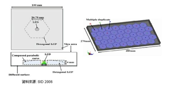 在2006年SID會(huì)議上,臺(tái)灣交通大學(xué)提出了一種整體上是直下式,而單個(gè)來看卻是采用側(cè)射式的LED,從而提高了其光線利用率,減少了所需LED數(shù)目并提高了效率。這種技術(shù)主要是采用側(cè)射式LED搭配以六角形導(dǎo)光單元.