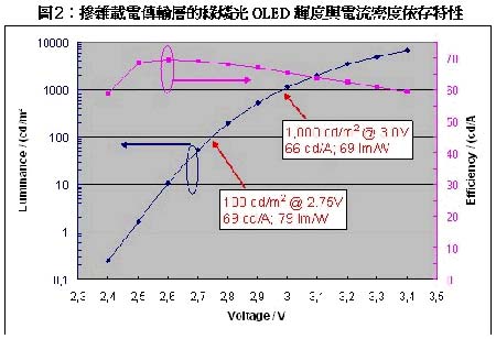 根據實驗結果顯示,65cd/A與80lm/W(在100cd/m2,2.6V)的綠色磷光OLED,經過doping后的載電荷子傳輸層(如下圖所示),它的內部量子效率(quantumefficiency)可以達到接近100%(相較之下Out-coupling系數只有20%),而且可以獲得較佳的亮度,運作電壓更接近熱力極限。