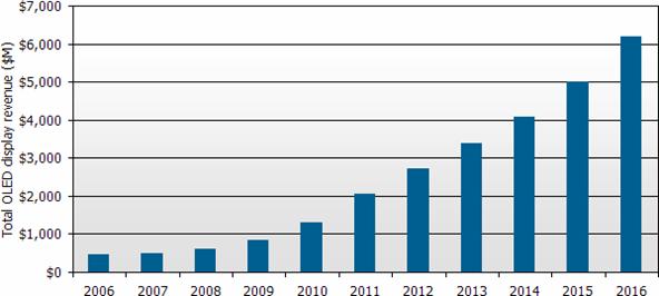 “根據DisplaySearch最新發表季度OLED(有機發光二極管顯示器)出貨報告指出,第二季全球OLED出貨金額創新高達1億9千2百萬美元,較上一季成長32%,與去年同期相比成長22%。DisplaySearch預測全球OLED產值將從2008年6億美元,按每年33%復合成長率成長,估計到了2016年整體產值將達到62億美元;其中手機主屏仍是最主要的應用,2016年出貨金額估計為30億美元,同時OLED TV產值將達20億美元,成為OLED第二大應用產品。