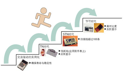 之所以會存在使用壽命和可靠性方面的問題,主要是因為將直流電壓加載到液晶上時,液晶材料及電極會發生氧化還原反應而變質。雖然也可以采用交流電來驅動液晶,但是顯示性能較差。最終解決這一問題的是夏普公司。該公司發現,如果在液晶材料中加入離子性雜質,使其導電率升高,就可以采用交流驅動獲得良好的顯示特性。利用這項技術,1973年5 月,夏普公司推出全球首款液晶應用產品—— 使用液晶顯示屏作為顯示部件的小型計算器EL-805。