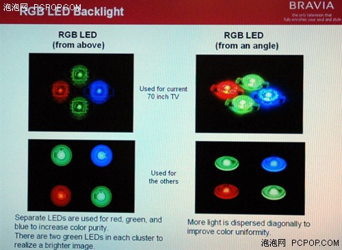 首先從RGB三色LED的排列順序上來看,新一代的“動態麗彩LED背光源”采用了正方形排列,上下的LED顆粒不再像上一代那樣交錯分列,這樣的排列方式可以將整個屏幕實現更為精確的區域劃分,為下一步的區域條光埋下伏筆。