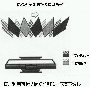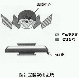 利用這種原理可以針對觀視者觀賞畫面時的最適當位置,除了提供觀視者左右兩眼影像之外,由影像正面的顯示區到最適距離所函蓋的區域,對觀視者而言就變成正常的立體三次元影像。不過兩眼視線相鄰處的影像,會被左、右兩眼在無意識狀態下捕捉讀取形成所謂的逆視領域,換句話說使用這種三維立體影像分割器的觀視者必需固定在一定的觀視位置才能產生立體視覺效果(圖2)。