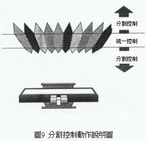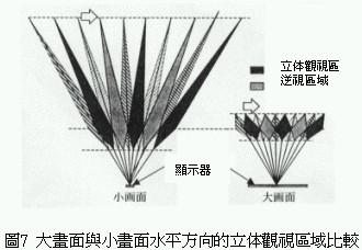 傳統的不需專用眼鏡的三維立體影像顯示器,同樣水平方向時小畫面的前后方向的立體可視范圍比大畫面的立體可視范圍大(圖7),這是因為小畫面的視角比較小,液晶顯示器與影像分割器較不容易產生所謂的moire干涉縞。利用這種物理現象將液晶顯示器與影像分割器,藉由電子方式分割成16等份各別掌控專屬區域(圖8)