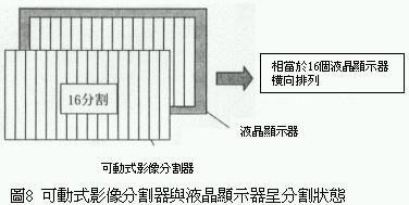 上述新型電子式影像分割器與液晶顯示器的控制方法與結構都非常簡單,因此它具有低價化的潛力。