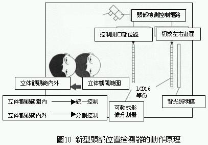 為了改善上述缺失因此開發出頭部檢測系統(headtrackingsystem),利用這種檢測系統可隨時偵測觀視者頭部位置,一旦產生逆視領域時顯示器會立即切換左右兩眼所讀取的影像,如此一來不但可以防止逆視問題的發生,還可以擴大三次元立體影像的可觀視范圍.