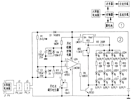 1.電路原理太陽能電池板輸出的光伏電壓PV_out經插座J1、J2接至電路板,該電壓分成兩路:一路經二極管D1與蓄電池相連,給蓄電池充電,同時向U1、U2提供工作電壓;另一路經R1及C2、DW1、R11并聯分壓后加至運放U2(LM358)的反向輸入端②腳,作為天是否“黑了”的檢測電壓,運放同相輸入端③腳則接于R4與(R5+VR1)串聯電路的分壓點上。其中。VR1是草坪燈點亮調節微調電阻,調節VR1改變U2同相輸入端的比較電壓值,即可改變草坪燈的開燈設置點。