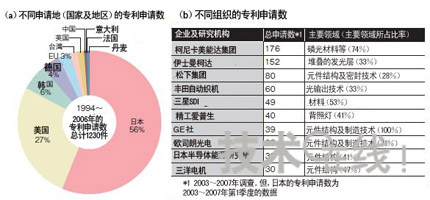 這兩家企業的出資公司也是相同的。著眼于有機材料的應用,不惜賭上公司命運的柯尼卡美能達已率先開始投放廣告。該公司2007年3月與GE在有機EL照明業務上展開合作,“除銷售渠道以外,我們在照片相關業務中積累的有機材料技術及光學系統技術都大有用武之地”(柯尼卡美能達董事長兼尖端材料技術研究所所長駒村大和良)。具體用途為:照片感光材料方面的經驗可用于發光材料等的開發中;鏡頭等光學系統技術可用于光輸出用途;能夠制造出多達15層的多層負片技術可用于卷對卷(Roll-to-roll)制造技術。對柯尼卡美能達而言,“能夠匯集該公司已經撤出的照片業務的人才及經驗的就是有機EL照明業務”(該公司董事兼LA業務推進室長得丸祥)。基礎開發日本領先柯尼卡美能達的雄心壯志還表現在專利申請數量上。在有關有機EL照明的專利中,日本的申請數占了全球的近2/3,大大領先于美國等其他國家。其原因之一,就是因為柯尼卡美能達的申請數量很多。尤其是藍光磷光*材料相關專利,柯尼卡美能達的申請數量占到了整體的近3/4)。