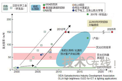 政府機構的資助額大多為3年內數億~30億日元的規模,德國“OPAL(OrganicPhosphorescentlightsforApplicationsintheLightingmarket)”項目為5年內1億歐元(約合140億日元),遠遠多于其他項目。在發光效率方面迅速追趕白色LED有機EL照明雖然具有一些獨特的特點,但考慮到實際影后,還是避免不了在發光效率、使用壽命、成本等基本性能上與白色LED及現有照明技術一決高低。近來有機EL照明的性能得到了大幅提高。首先是發光效率。目前,有機EL照明在研發水平上比白色LED約落后約2年。2008年6月美國UniversalDisplay(UDC)發布的“102lm/W”的發光效率,與2006年3月日本日亞化學工業發布的白色LED的發光效率不相上下。山形大學的城戶表示,“已經看到了實現200lm/W的曙光”)。
