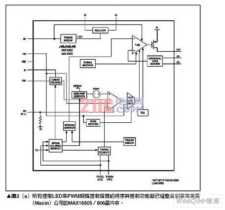 MAX16805∕806的內(nèi)部參考電路應(yīng)用在反饋回路中來監(jiān)測LED電流,同時可以通過串行接口加以調(diào)整,這將能夠讓所有的LED串共享一個固定的感測電阻,有效簡化生產(chǎn)并降低成本。