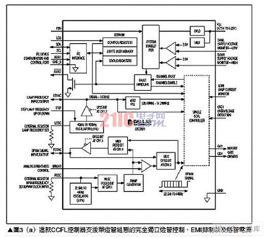 傳統(tǒng)上LCD面板使用CCFL燈管作為背光源,主要是這項技術(shù)擁有良好效率、低溫以及高照明能力等優(yōu)勢,雖然CCFL控制器在非汽車類應(yīng)用中,例如液晶電視或液晶顯示器上相當(dāng)成功,但汽車的工作環(huán)境卻對這項技術(shù)帶來特殊的挑戰(zhàn)與要求,為了讓元件數(shù)減少,CCFL控制器必須包含包括如EMI抑制、燈管電流過度驅(qū)動(overdrive)能力,以及將接腳數(shù)降到最低的串行控制接口、各信道燈管失效監(jiān)測、燈管頻率與DPWM控制用精確內(nèi)建振蕩電路以及其它功能等,這類解決方案有美信(Maxim)公司的DS3881,請參考圖3(a),其只需少許的外加電路,就能夠組合出完整的CCFL電源控制子系統(tǒng),請參考圖3(b)。DS3881主要針對汽車應(yīng)用環(huán)境進(jìn)行最佳化設(shè)計,由于所采用的基礎(chǔ)電路組態(tài),因此外部晶體管、變壓器以及燈管本身就形成了EMI的噪聲來源,DS3881通過使用展頻與頻率偏移技術(shù)來降低EMI發(fā)射,并將任何未移除噪聲移到非關(guān)鍵頻帶來解決這個問題。