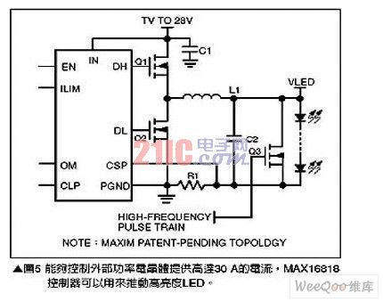 對于需要高照明功率,例如照明燈或霧燈等應(yīng)用就必須使用多個高亮度LED(HighBrightLED;HBLED),但是高亮度LED卻需要超高驅(qū)動電流,要產(chǎn)生所需的電流會使用太多的驅(qū)動芯片,因此較簡單的解決方案是使用可以推動高電流晶體管的控制器,為高亮度LED提供高達(dá)30A的電流,這類組件的一個范例為MAX16818,請參考圖5。