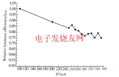 當電流增加時,注入發光區的電子發生非輻射復合的幾率變大,使器件的內量子效率降低,同時,由于電流增加導致器件的溫度升高,使熒光粉的量子效率降低并進一步增加了非輻射復合的幾率。在圖5中,由于驅動電流在正常的工作電流內,器件的發光效率雖有一定的降低,但變化的幅度并不大。