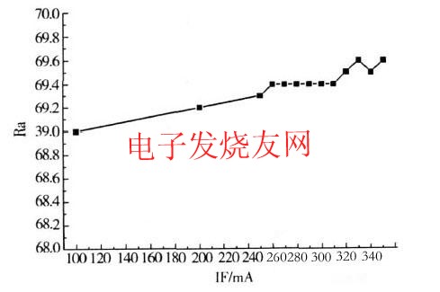 由于藍光LED與$熒光粉組成的白光系統,其光譜中缺少紅光成分,顯色指數還不理想,這也是目前業界研究的重點課題。顯色指數與光譜成分有關,電流增加但并不影響出光的光譜的分布,所以器件的顯色指數幾乎沒有變化。