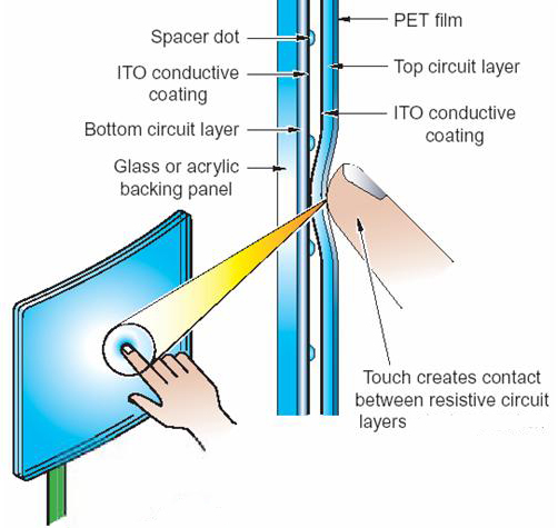 電阻式:從目前的推廣應用來看,電阻式觸摸屏是占主導地位的觸摸技術。它由玻璃面板,銥錫氧化物(ITO)電阻涂層組成,并帶有導電涂層的護板,沿著邊緣有銀色的總線條。兩個層之間用絕緣小點隔開。觸摸屏幕時,護板彎曲與玻璃上的涂膜相接觸(圖1)。