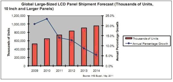 IHS iSuppli公司的研究顯示,第一季度電視、臺式電腦顯示器和筆記本電腦的消費需求低迷,將導致2011年全球大尺寸液晶面板出貨量增長速度低于2010和2009年。2011年全球大尺寸液晶面板出貨量將僅增長14%,而2010和2009年分別是23.4%和20.8%。今年的單位出貨量將為7.4億塊,高于2010年的6.493億塊。