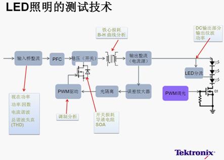 要達到高品質的驅動電源設計標準,就需要進行全面的測試測量分析,如圖1所示,LED照明測試主要包括5個部分:電源質量、諧波、功率開關器件測量、調制分析以及驅動輸出參數(shù)測試。