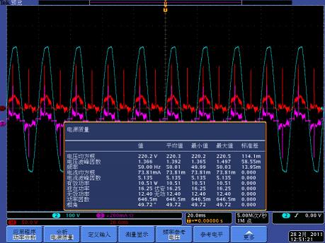 測量驅動電源的輸入功率、功率因數(shù)和諧波有很多方法,使用具有電源分析功能的泰克示波器產(chǎn)品可以輕松實現(xiàn)這些電能質量測量。使用一路通道測量輸入電壓、一路通道測量輸入電流,配合示波器內置的PWR電源分析軟件,所有的電能質量相關參數(shù)可以直接顯示在屏幕中。