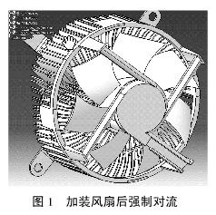 主動(dòng)散熱常用液冷、熱管、風(fēng)冷等方式。由于液冷使用的液體必須在泵的帶動(dòng)下強(qiáng)制循環(huán)帶走散熱器的熱量,熱管則依靠高導(dǎo)熱性能的傳熱元件在全封閉真空管內(nèi)的液體的蒸發(fā)與凝結(jié)來傳遞熱量,二者都不適合車燈內(nèi)使用。風(fēng)冷散熱具有價(jià)格較低、安裝簡單等優(yōu)點(diǎn)最為常用。針對被動(dòng)散熱方式存在的散熱器中心區(qū)域溫度相對集中的情況,加裝風(fēng)扇強(qiáng)制對流后(見圖1),對緩解散熱器溫度不均勻有明顯效果。