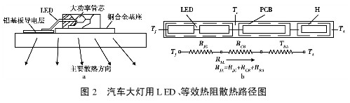 本文研究的LED汽車前大燈主要散熱路徑是:管芯→銅合金基板→鋁基板→散熱器或機(jī)殼→環(huán)境空氣,(見圖2b)。若LED的結(jié)溫為TJ,環(huán)境空氣的溫度為TA,散熱墊底部的溫度為Tc(TJ>Tc>TA),在熱傳導(dǎo)過程中,各種材料的導(dǎo)熱性能不同,即有不同的熱阻。管芯傳導(dǎo)到散熱墊底面的熱阻為RJC(LED的熱阻)、散熱墊傳導(dǎo)到PCB面層敷銅層的熱阻為RCB、PCB傳導(dǎo)到環(huán)境空氣的熱阻為RBA,則從管芯的結(jié)溫TJ傳導(dǎo)到空氣TA的總熱阻RJA,RJA與各熱阻關(guān)系為:RJA=RJC+RCB+RBA,銅合金基板和鋁基板導(dǎo)熱性能接近且熱阻小,其導(dǎo)熱性能就好,即散熱性能也越好。該散熱結(jié)構(gòu)的總熱阻比常規(guī)結(jié)構(gòu)減少近26%。