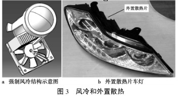 (2)強(qiáng)制對流提供與外界空氣熱交換。在散熱片的背面加裝風(fēng)扇促使強(qiáng)制空氣流動(dòng)。風(fēng)扇加速了散熱片的熱交換的同時(shí),流動(dòng)的空氣也直接從PCB板上帶走了部分熱量。由于燈體的狹小且密封,與外界的空氣對流幾乎不可能。圖3a所示風(fēng)冷結(jié)構(gòu)中風(fēng)扇的強(qiáng)制對流可以緩解散熱器中心區(qū)域與周圍環(huán)境的溫度不均勻,使燈體內(nèi)部和燈體外殼的溫度盡量接近。有助于將內(nèi)部的熱通過外殼和外置散熱器傳導(dǎo)出去。