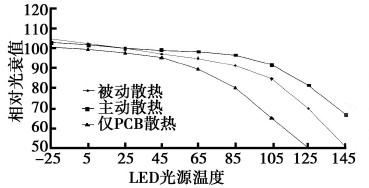 圖4是LED光源溫度與光衰在不同的散熱方式下的關(guān)系曲線。圖中可見僅PCB散熱、加散熱器的被動(dòng)散熱和強(qiáng)制對流的主動(dòng)散熱3種不同散熱設(shè)計(jì)存在相當(dāng)大的差異。后二種在105℃時(shí),基本上能夠提供80%以上的出光率。