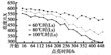 我們對圖3b所示的前大燈樣件做了不同條件下的光衰測試,試驗(yàn)建立在LED散熱良好的基礎(chǔ)上,模組安裝在大燈封閉殼體內(nèi),溫度檢測點(diǎn)在LED光源附近。試驗(yàn)數(shù)據(jù)采集時(shí)的環(huán)境溫度是在燈體外部施加的。試驗(yàn)結(jié)果表明環(huán)境溫度60℃時(shí),光衰緩慢;100℃時(shí),光衰加劇(見圖6)。