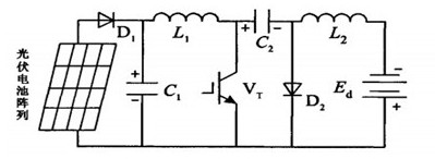 充電控制器作為光伏電池和鉛酸蓄電池的接口電路,一般都希望讓其工作在最大功率點,實現更高的效率,但是在實現最大功率點跟蹤(MPPT)的同時,還需要考慮進行蓄電池充電控制。目前常用的主電路拓撲主要有降壓型電路(Buck)變換器、升壓型電路(Boost)變換器、丘克電路(Cuk)變換器等。一般光伏電池輸出電壓波動較大,而Buck變換器或Boost變換器只能進行降壓或升壓變換,受此影響,光伏電池不能在大范圍內完全工作于最大功率點,從而造成系統效率下降。同時,Buck變換器輸入電流紋波較大,如果輸入端不加一個儲能電容就會使系統工作在斷續狀態下,從而導致光伏電池輸出電流時斷時續,不能處于最佳工作狀態;而Boost變換器輸出電流紋波較大,用此電流對蓄電池進行充電,不利于蓄電池的使用壽命;Cuk變換器同時具有升壓和降壓功能,將Cuk變換器應用于光伏系統充電控制器中,可以在較大范圍內實現最大功率點跟蹤,有利于系統效率的提高。因此,常選用Cuk變換器作為充電控制器的主電路,其系統拓撲如圖7所示。
