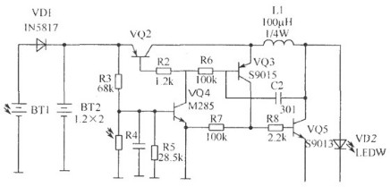 該電路的工作原理:白天有太陽光時,由BT1把光能轉換為電能,由VD1對BT2充電,由于有光照,光敏電阻呈低阻,VQ4 b極為低電平而截止。當晚上無光照時光敏電阻呈高阻,VQ4導通,VQ2 b極為低電平也導通,由VQ3、VQ5、C2、R6、L1組成的DC升壓電路工作,LED得電發光。