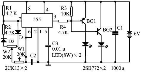 用555 時基電路可組成各種形式的自激式多諧振蕩器。大功率LED 頻閃光源,主要由1 個555 多諧振蕩器構成的信號發生器、1 個功率放大器和2 個LED 組成。信號發生器的作用是產生所需要的工作頻率脈沖,并且振蕩頻率可以根據需要調整。功率放大器將脈沖信號放大后,驅動大功率LED 發光。改變信號發生器的振蕩頻率,可使光源的頻閃時間間隔隨之變化;過增、減LED 個數或更換不同功率的LED ,可以改變光源的總亮度。如圖3 所示,電路中的555 多諧振蕩器電路,既可以調節振蕩頻率,又可以調整振蕩脈沖的占空比。信號發生器的振蕩頻率就是LED 閃光的頻率,可以根據拍攝對象調整。而振蕩脈沖的占空比,決定了LED 每次頻閃的延續時間。