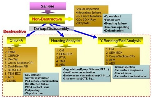 從上可知,一個(gè)LED產(chǎn)品的失效,起因可能來(lái)自于該產(chǎn)品的任何一個(gè)部份,故必須抽絲剝繭方能找到真正的失效原因。針對(duì)失效來(lái)自LED燈粒而言,因完整的LED燈粒中,LED chip本身很強(qiáng)壯,但包復(fù)chip的封裝材料則易遭受損傷,因此,LED燈粒的失效多可歸因于封裝材料的破壞或劣化所導(dǎo)致。若要充分解析這類(lèi)失效,牽涉到光學(xué)、化學(xué)、材料學(xué)、電子物理學(xué)等領(lǐng)域的專(zhuān)業(yè)知識(shí),并搭配精密的儀器與豐富的實(shí)務(wù)經(jīng)驗(yàn),才能確認(rèn)失效點(diǎn)并推導(dǎo)真因,進(jìn)而提出改善對(duì)策。