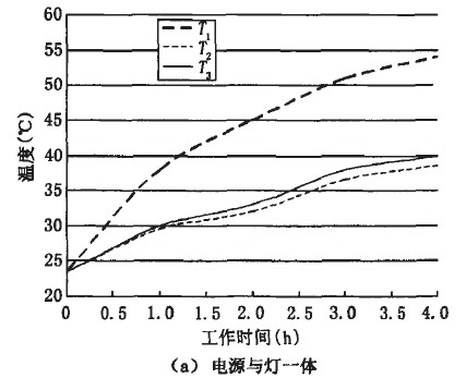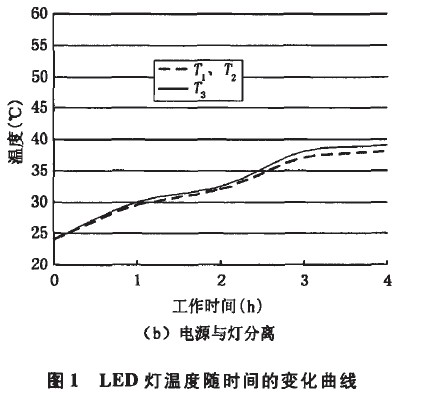 由于電源本身產(chǎn)生一定的熱量,使得LED燈上的熱量來源增加。同時,電源與燈一體設(shè)計使得LED燈整體受熱不均,這些因素都會導(dǎo)致燈具發(fā)生疲勞和早期失效,而影響其壽命。圖1為LED燈溫度隨工作時間的變化曲線,圖中T1為放置電源處溫度,T2為遠(yuǎn)離電源處溫度,T3為燈體中心溫度。從圖中看出,隨著工作時間的增加,圖1(a)中T1遠(yuǎn)大于T2和T3;圖1(b)中T1與T2兩曲線重合,T3略大于T1和T2。可見分離電源后,整燈的溫度分布很均勻。