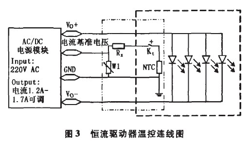 圖3為恒流電源給LED燈供電控制原理圖。電源的指標(biāo)為:220V AC輸入,電流1.2一1.7A可調(diào),電壓自適應(yīng)(36~39V)。圖3中左側(cè)細(xì)虛線框中部分為控制電路,其中W1為可調(diào)電阻器;NTC為負(fù)溫度系數(shù)熱敏電阻;Kt為常開溫度繼電器,其閉合溫度為56℃,自動斷開溫度為45℃;Rx為匹配電阻。圖3右側(cè)粗虛線框中部分為LED模塊部分。溫度繼電器和熱敏電阻安裝在LED模塊上,并與模塊緊密接觸,以便將LED的溫度信息反饋給控制電路。常溫下Kt